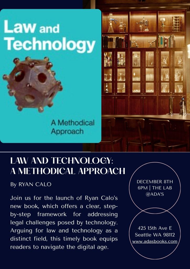 You’re invited to a conversation with Ryan Calo (Law, UW Seattle) about the frictions between law and technology in honor of the launch of his new book, Law & Technology: A Methodical Approach (Oxford University Press), on Monday, December 8, 2025 at 6 PM at Ada’s Technical Books & Café (425 15th Ave E, Seattle, WA 98112).